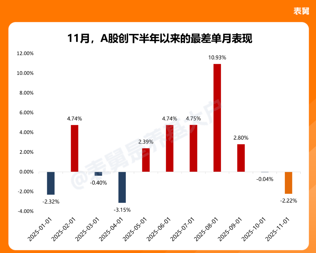 由于上周五已是11月的最后一个交易日,单看A股的话,下图,11月,wind全跌-2.2%,为年内第三差的表现,因此,如果大家的账户体感不佳,也实属正常,包括美股,11月的表现,也是5月以来最差的一个月。
