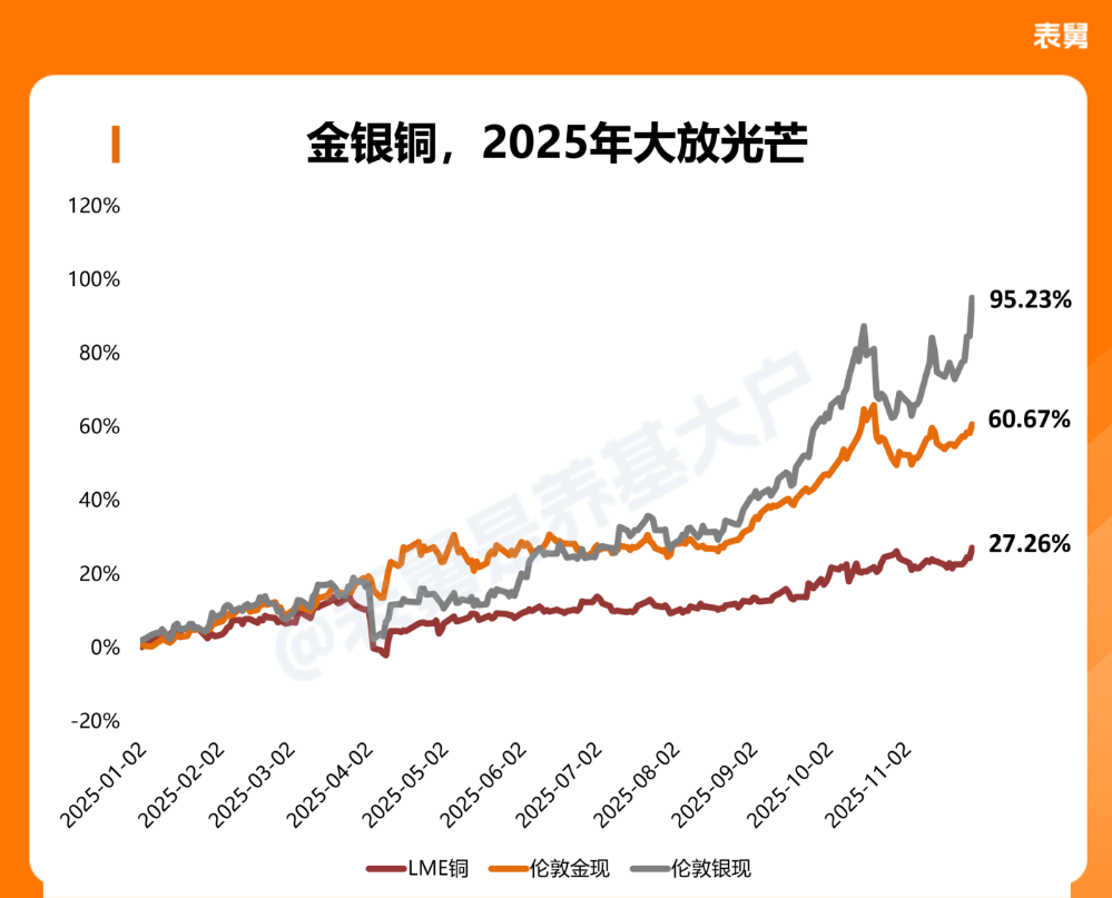 下图,是金、银、铜,三者今年以来的走势图,银价表现已经接近翻倍。
