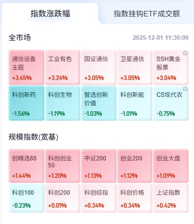 通信设备、工业有色、国证通讯等涨幅靠前,科创新药、科创生药、智选创新价值等小幅下跌,绝大多数行业上涨。