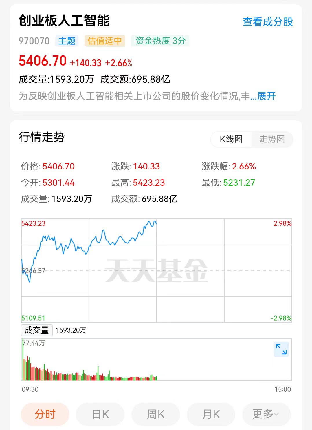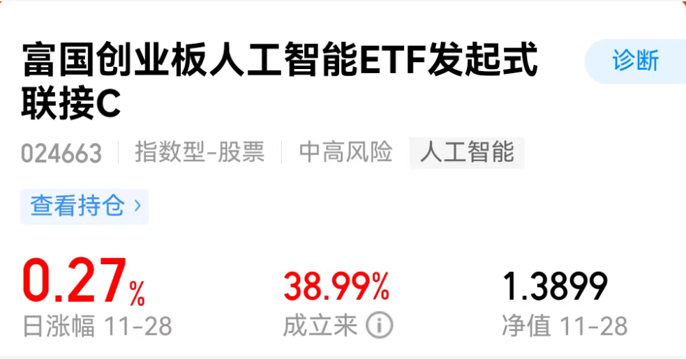 兄弟姐妹们,我是麦爸!今天可算等到放量上涨了,创业板人工智能指数直接大涨,麦爸手里的$富国创业板人工智能ETF发起式联接C(OTCFUND|024663)$,目前估值都涨了3%左右,太给力了!