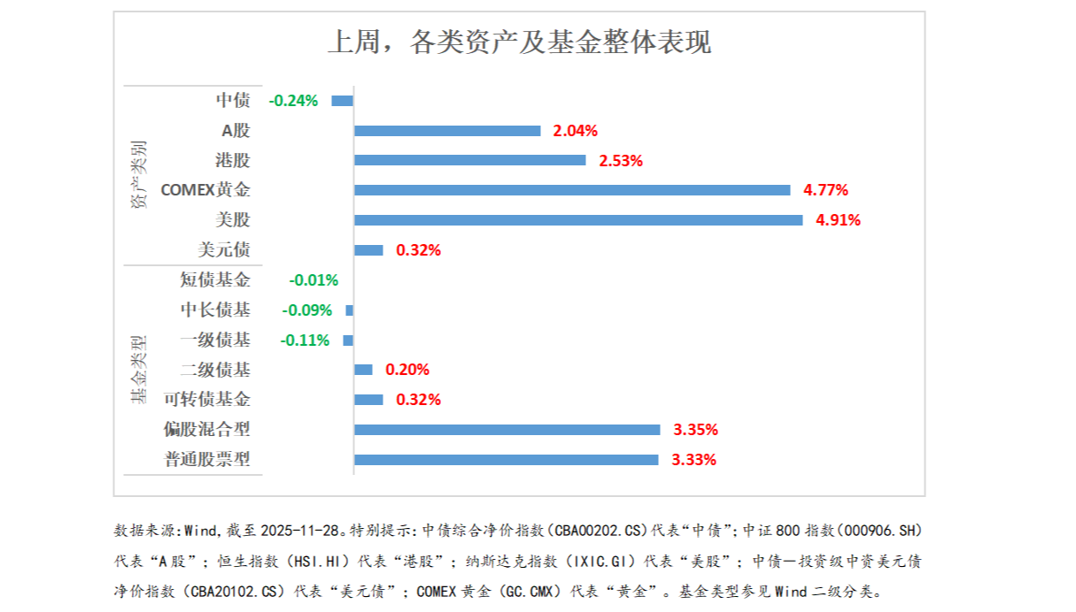 资产方面, 中债(-0.24%)下跌,A股(2.04%)、港股(2.53%)、黄金(4.77%)、美股(4.91%)、美债(0.32%)均上涨。