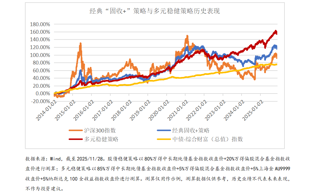 历史回溯来看,截至2025/11/28,经典固收+策略与多元稳健策略长期表现均优于纯权益或纯债券策略。