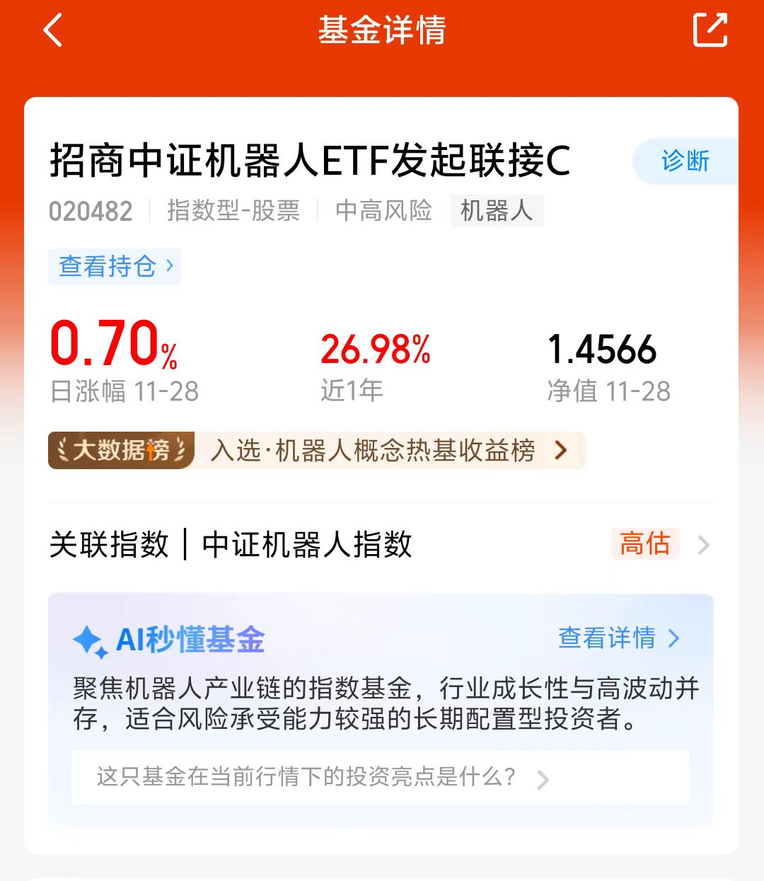 大盘今天继续上涨,机器人今天表现还不错,指数成功站上十日线,今天右侧布局机器人方向,今天加仓$招商中证机器人ETF发起联接C(OTCFUND|020482)$,近六个月涨了13.64%,近一年涨了26.98%,后期上涨空间还是很大的,长期看好这个方向,我准备继续分批布局了!
