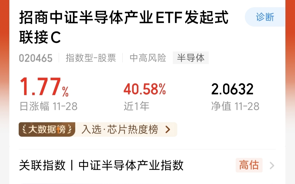$招商中证半导体产业ETF发起式联接C$ 这只聚焦半导体的指数基金。紧密跟踪中证半导体产业指数。前面覆盖了半导体的上下游产业链。所以说无论哪一个方向上涨都能够受益。且采用的指数化的投资,也不用担心主动调仓带来的波动风险。周五上涨了1.77%,同类业绩再度做到了领先。近一年涨幅40.58%。长期稳定盈利的能力。期待四季度继续创新高了。