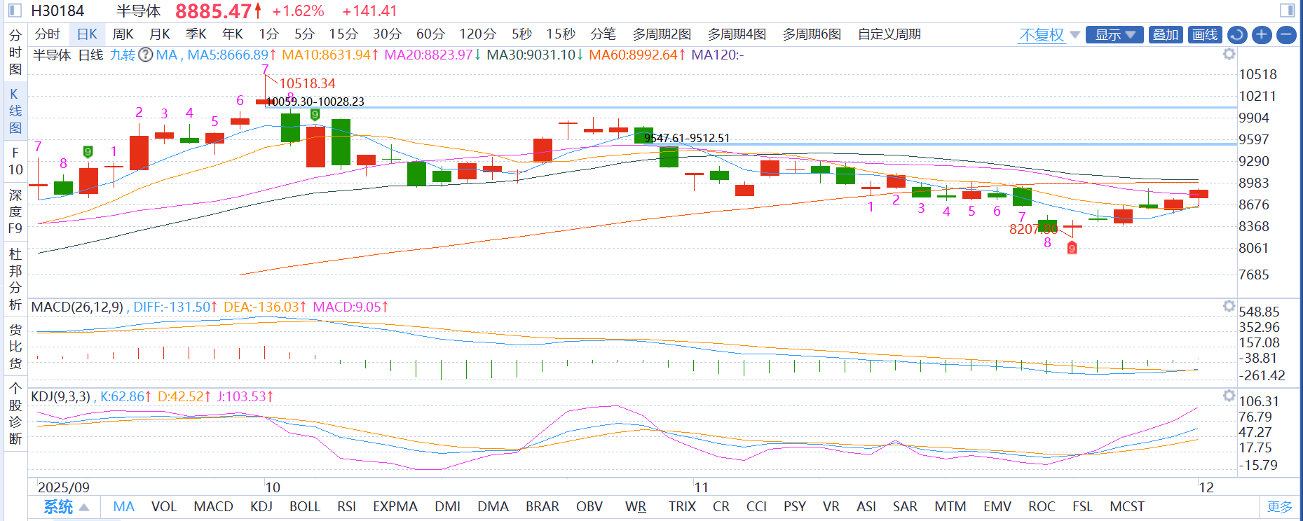 半导体:半导体板块受益AI算力需求和国产替代,技术面日线金叉红柱,均线耶是5日线上穿10日线,趋势向上,麦爸继续持仓看涨。