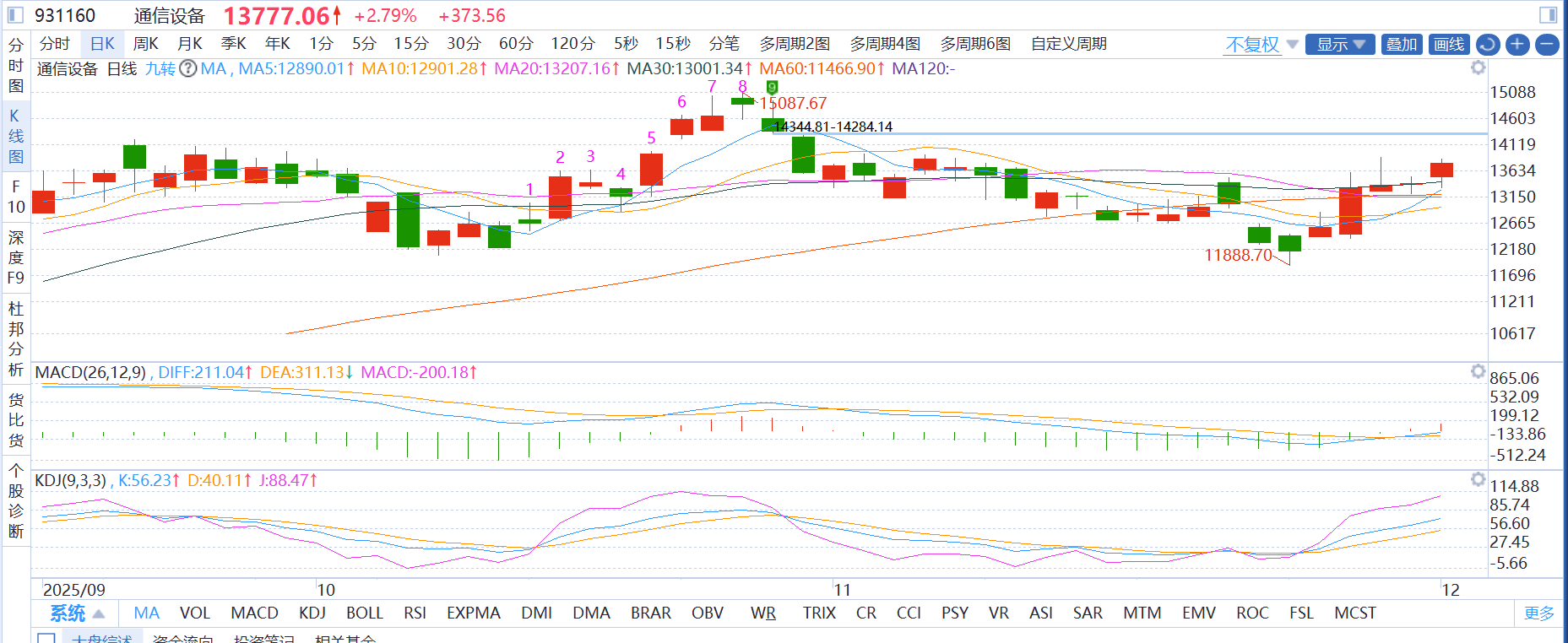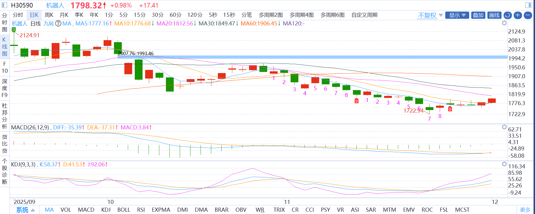 机器人板块:技术面日线级别底背离,MACD金叉红柱,处于上升通道,量能配合还算不错。消息面12 月 4 日脑机接口大会、9 日碳材料大会都给减速器、伺服电机加buff,麦爸继续持仓看涨。
