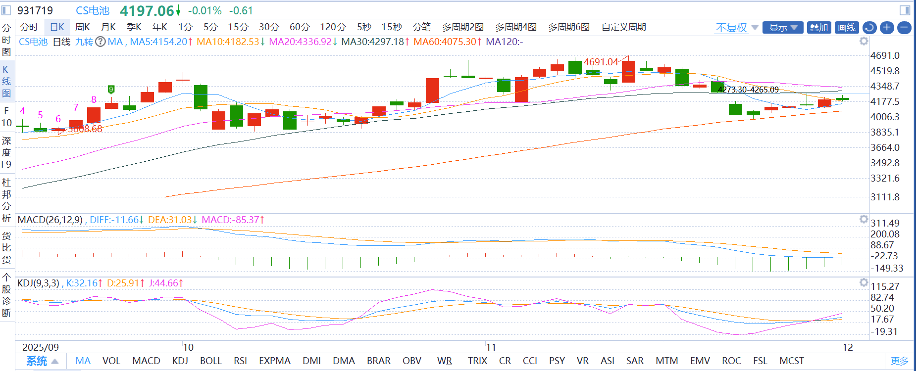 电池:技术面周线多头排列,看涨趋势明确向上。消息面新能源(储能、固态电池)列为跨年行情有望上涨的方向之一,麦爸选择持仓待涨。