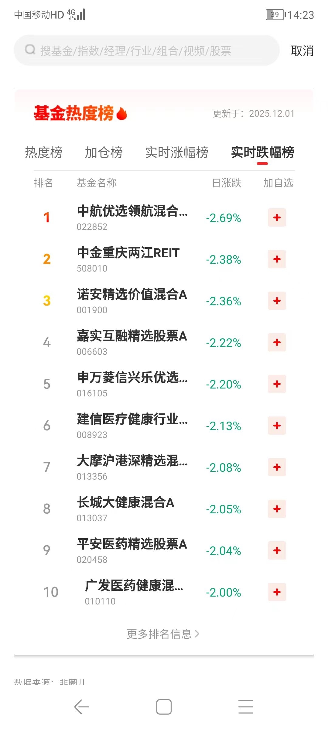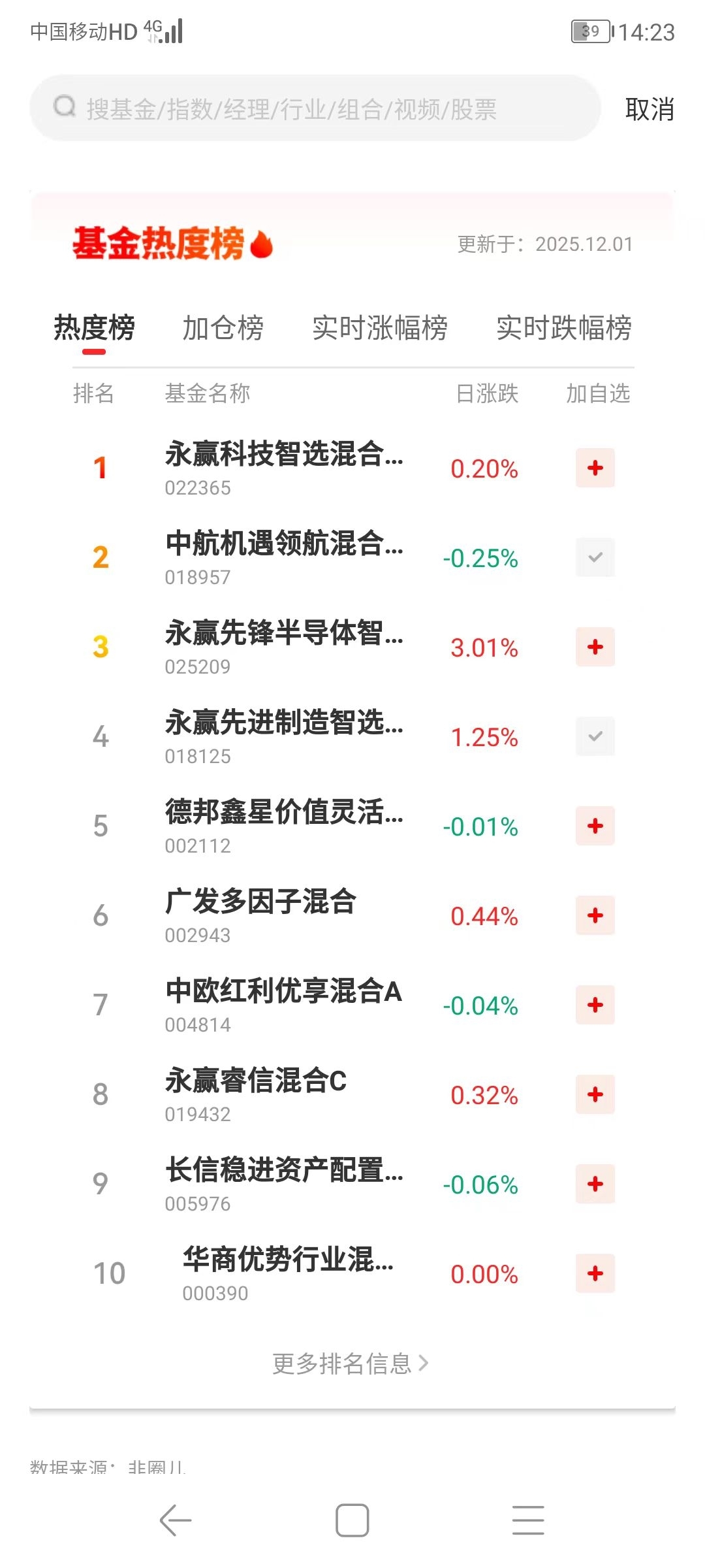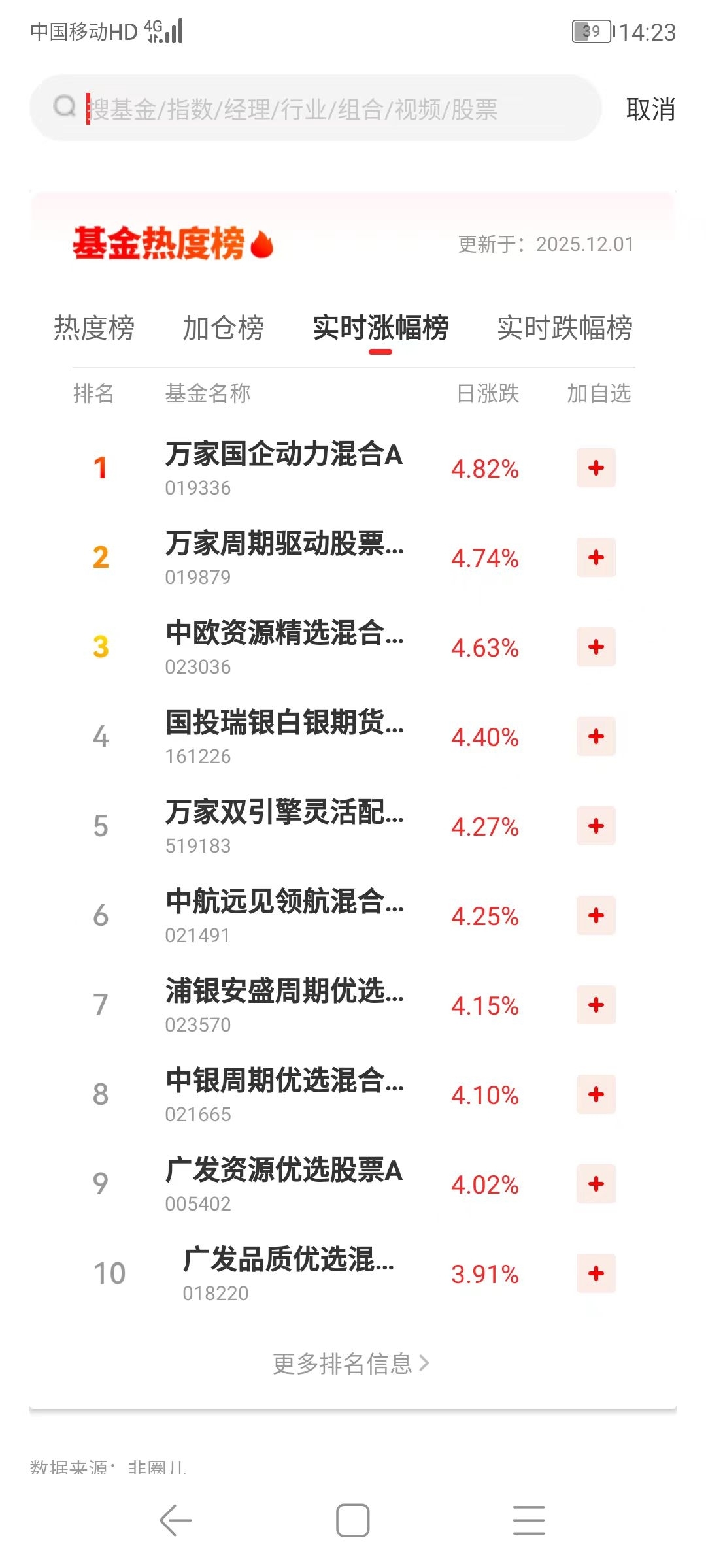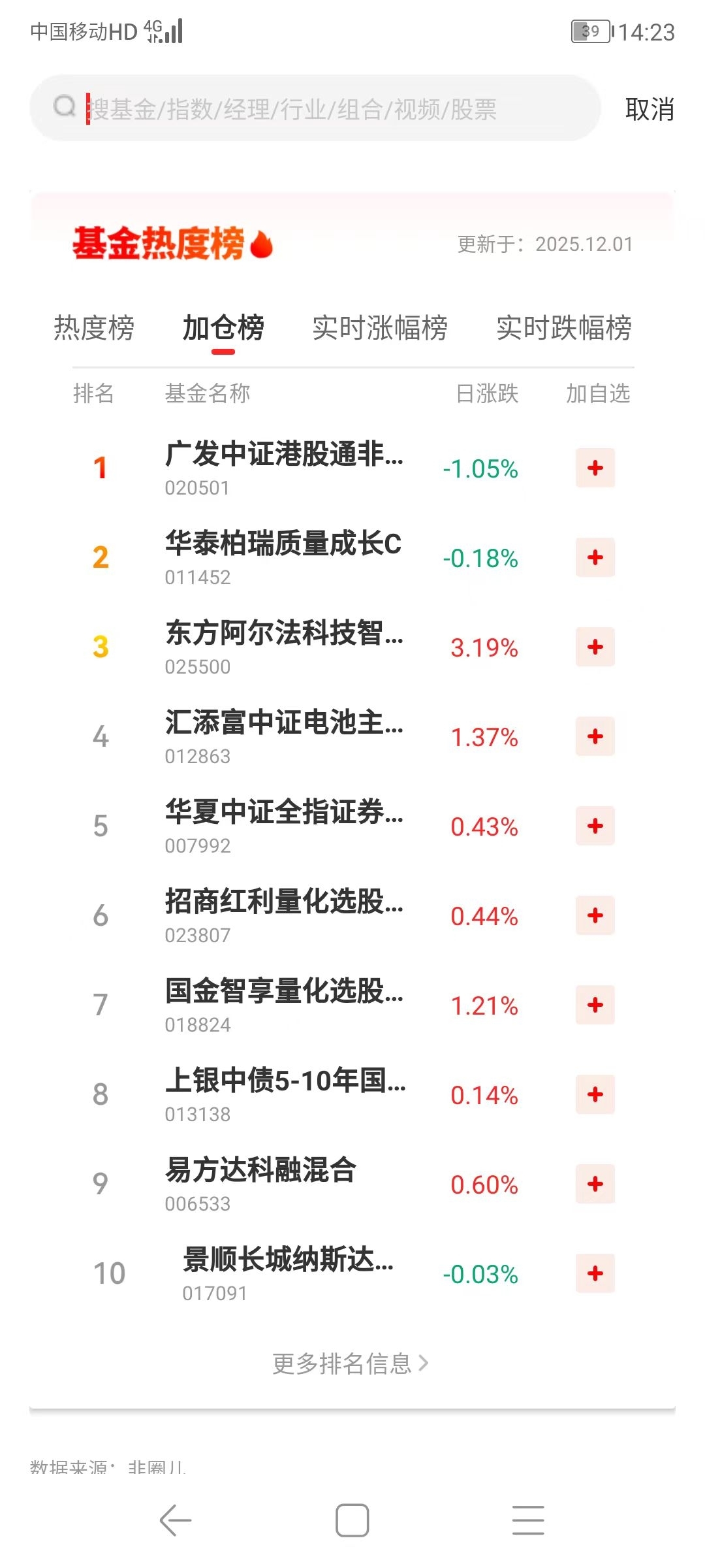 12月1日基金热度榜,加仓榜,实时涨跌幅榜。