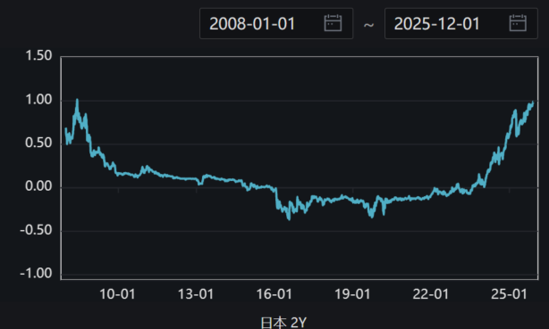 答:今天,债市最大的新闻,其实在日本——由于日本央行行长发言后,日本12月降息预期快速抬升,导致日债收益率上行,下图,wind拉了一下,2年期日债,自2008年以来,首次向上突破了1%,而10年日债,今天上行超过5bps,到了1.85%上方,超过了10年中债的收益率。
