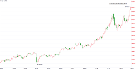 宏观层面上,美联储降息交易的反转也成为有色金属行情的助推剂。近期,美联储理事沃勒等官员陆续释放支持降息的信号,市场对12月降息的概率预期从一周前的约40%大幅上升至85%以上。降息预期推动美元走弱、美债收益率下行,显著降低了持有黄金、白银、铜等非生息资产的机会成本,吸引大量投机资金与避险资金涌入有色金属市场。
