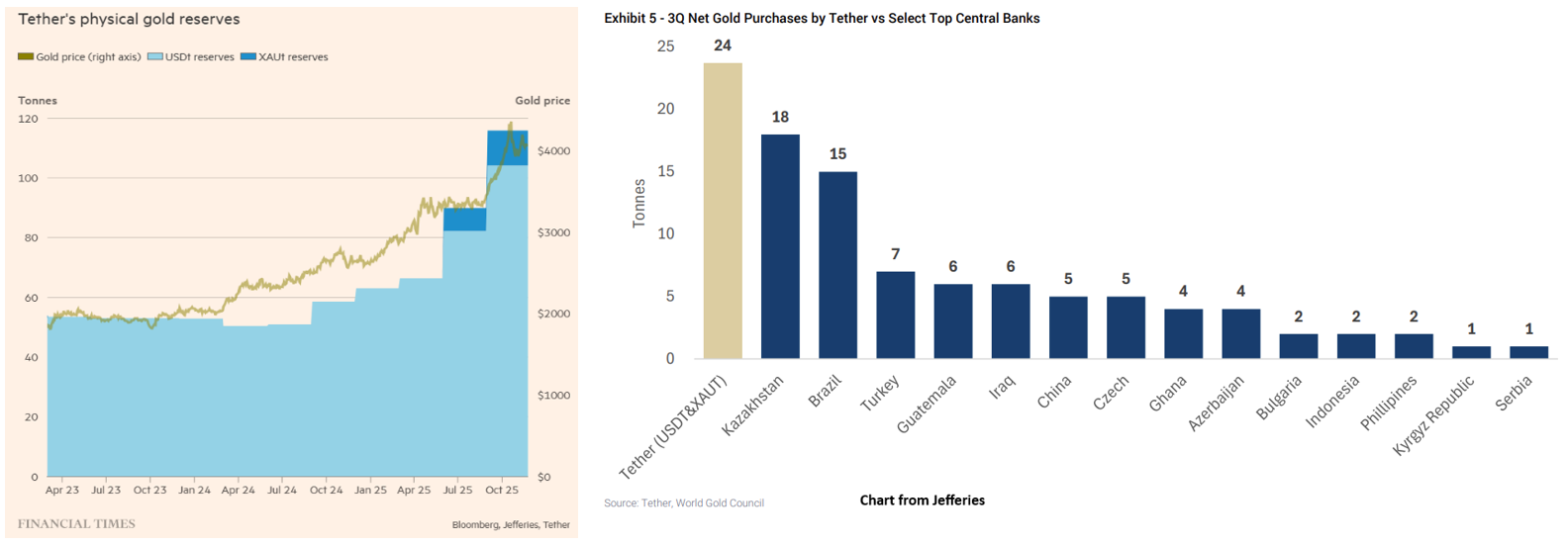 加密巨头Tether成黄金市场新势力,黄金购买量一度超过央行。今年推动金价屡创新高的关键买家,也有加密货币世界中最具争议的稳定币发行商Tether。据媒体周四报道,投资银行Jefferies测算显示,截至9月30日,全球最大稳定币USDT的发行商Tether持有116吨黄金,价值约140亿美元,使其成为除主要央行外最大的单一黄金持有者,持有量与韩国、匈牙利或希腊等国的官方储备相当。仅在第三季度,Tether购入约26吨黄金,占当期全球黄金总需求的2%,相当于已知央行购买量的12%。今年金价在两波上涨中累计上涨约2000美元,第二波涨势恰与Tether购金提速同步。Jefferies指出,Tether的需求“可能在短期内收紧了供应并影响市场情绪,进而驱动投机资金流入”。