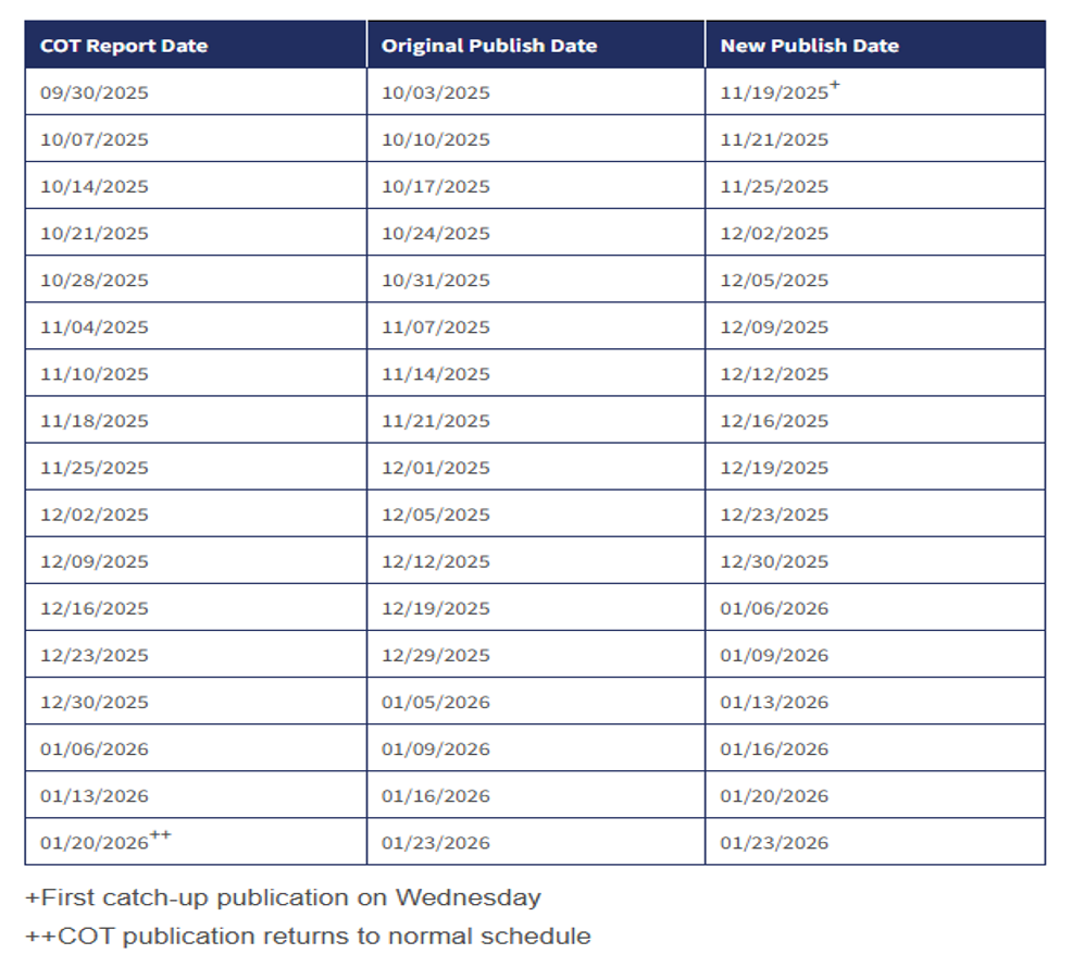 受美国联邦政府“停摆”影响,10月1日起美国证券交易委员会和美国商品期货交易委员会等多个重要金融监管机构的大部分职员“停薪休假”,故披露数据暂时延迟。美国商品期货交易委员会(CFTC)于11月18日在官网披露数据补发计划,自11月19日起开始补发9月30日至今缺失的报告数据。CFTC将逐步提高发布频率,使2026年1月23日以后恢复正常发布报告。
