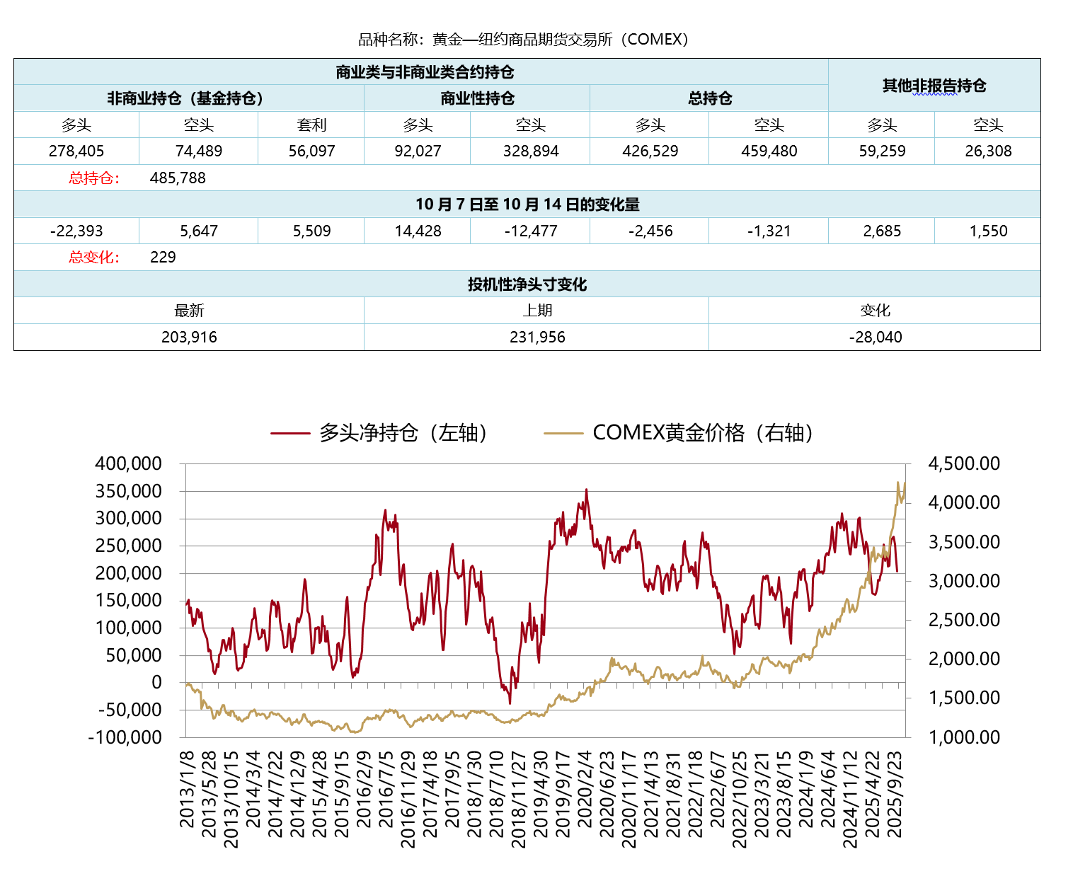 截至2025年12月1日,最新公布的美国商品期货交易委员会(CFTC)10月14日黄金持仓数据显示:COMEX黄金投机净多头头寸由上一期(10月7日)的231,956手下降至203,916手,净多头头寸减少。