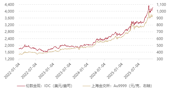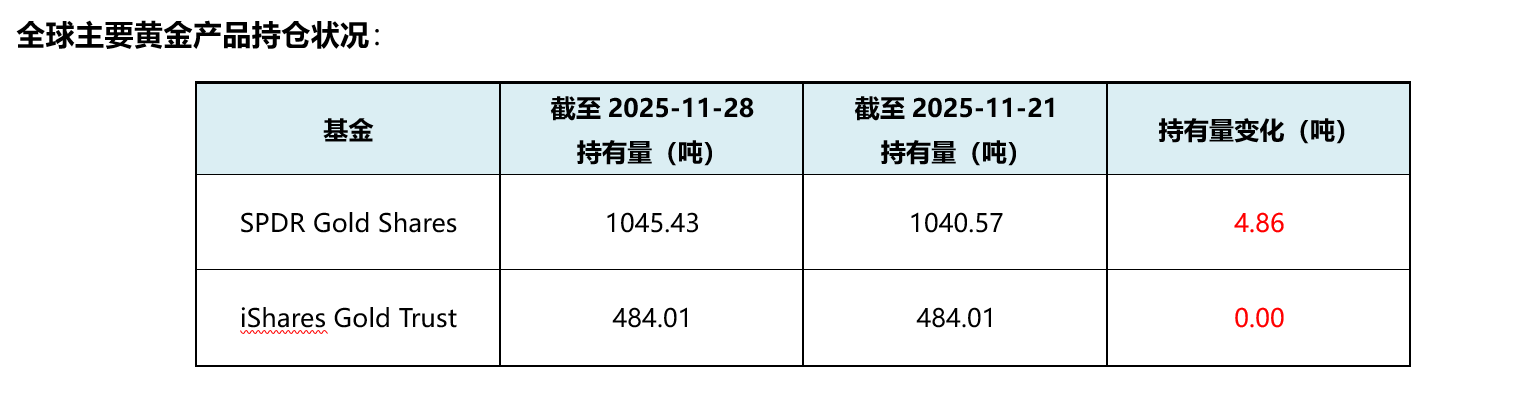 截至上周五(11月28日),伦敦现货黄金报收4218.55美元/盎司,自11月21日以来累计上涨154.27美元/盎司,涨幅3.80%。上周伦敦现货黄金价格震荡走强,金价周一盘中最低触及4039.89美元/盎司,周五最高上行至4226.80美元/盎司。回顾上周以来海外主要市场动态:美国9月PPI温和反弹;多位美联储官员表态支持降息,目前降息预期大幅提升至超80%,支撑金价上涨;地缘方面,俄乌和谈前景仍然有较大不确定性,特朗普表示将对委内瑞拉开展行动,中日紧张关系未见缓和,地缘风险利好黄金避险属性。目前美元指数弱势、美债维持低位,对金价的利空左右或有限。短期市场聚焦12月美联储会议,中长期“美联储降息周期+海外不确定性加剧+全球去美元化趋势”对于金价构成一定支撑,或可考虑逢低分批布局。关注本周美国9月PCE报告,本周末中国公布11月央行购金情况等。