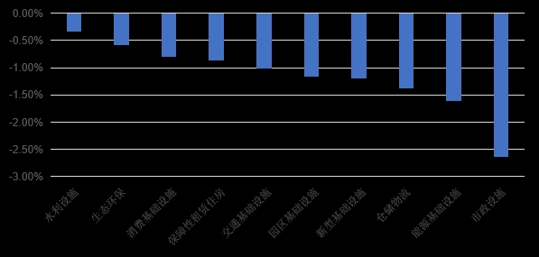 分类型来看,水利设施(-0.34%)、生态环保(-0.58%)、消费基础设施(-0.81%)类REITs跌幅较小,市政设施(-2.64%)、能源基础设施(-1.62%)、仓储物流(-1.37%)类REITs跌幅较大。