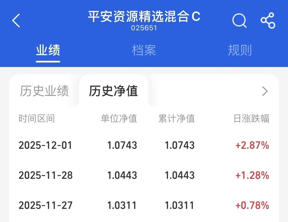 综上小曾认为,有色金属后续或还有上涨空间,小曾关注到平安资源精选混合发起式C(025651)刚好重仓有色金属,今天也是直接收涨2.87 %,先加入自选,准备逢低分批建仓!$平安资源精选混合发起式C$
