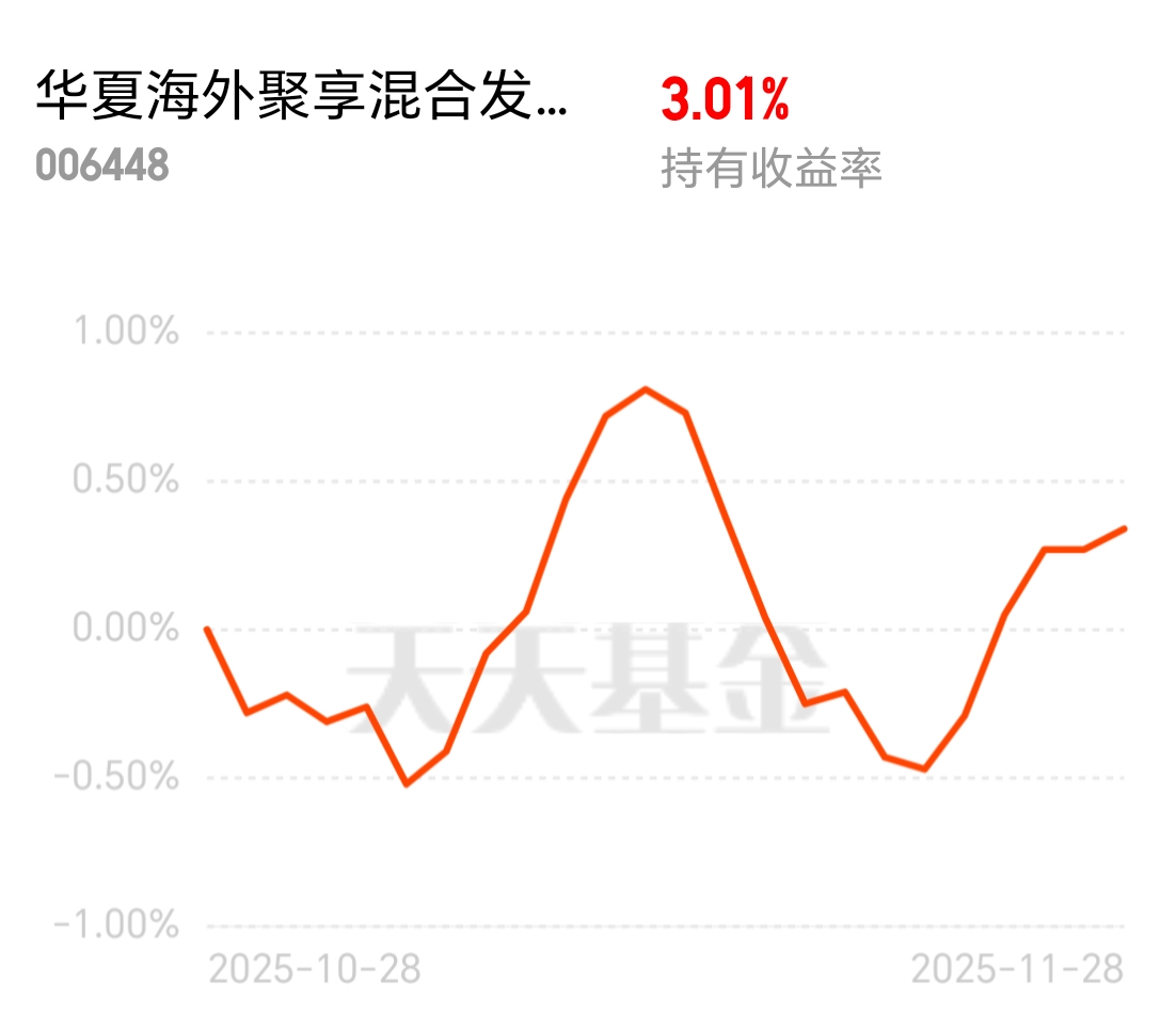 建信富时100波动较小,也比较适合作为海外资产持有。华夏聚享自2月份买入以来,收益3.01%,波动也比较小,仓位主要聚焦海外债券,股票仓位主要以港股和美股为主,不过现在已经限购了,需要预约购买。