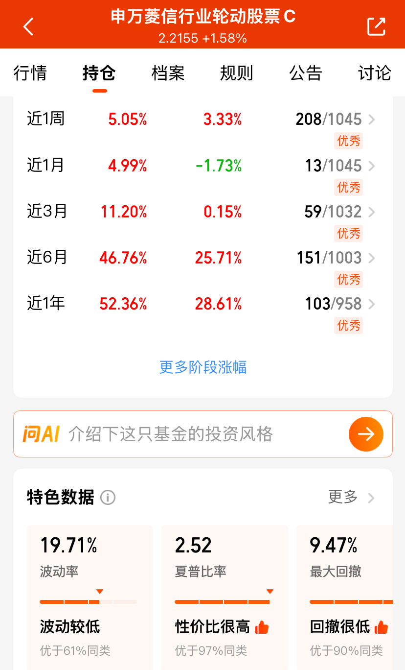 今天股市喜迎开门红,随着指数的拉升,有色板块盘中暴走,其中申万菱信行业轮动C今晚更新大涨1.58%,表现十分亮眼了, 它重仓紫金矿业,聚焦有色金属资源龙头股,夏普比率优秀且回撤也比较低,近一年涨幅52.36%,随着美联储降息预期升温,叠加AI需求扩增,后续行情一触即发!$天弘工业有色金属指数C(OTCFUND|017193)$$长城周期优选混合发起式C(OTCFUND|021637)$#12月基金投资策略#