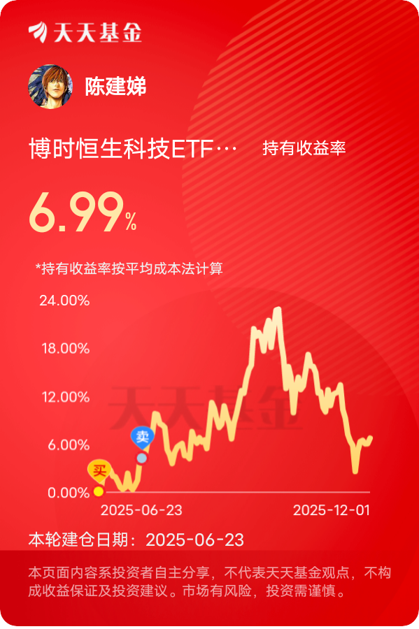 #青禾创作计划# 我认为恒生科技短期走势偏弱,核心是A股科技板块弱势拖累、传统板块短暂抬头分流资金、港股三季报前静默期缺乏催化等短期因素叠加导致,这些扰动并未触及板块底层逻辑,更不影响优质企业的长期发展。对我而言,这种利好空窗期、单板块跑输整体的时刻,反而正是难得的低位布局窗口——港股作为成熟资本市场,不像A股那样存在极强的结构分化,当前代表市场整体的恒生指数持续向好,足以印证市场基本面的支撑力度,恒生科技作为港股核心成长板块,自然不会长期缺席行情。从长期看,板块龙头企业盈利稳健、AI技术落地加速、政策支持持续加码,叠加估值仍处于历史相对低位,成长确定性与修复空间兼备。因此我选择坦然面对短期弱势,保持坚定持仓,不被短期波动左右决策,耐心等待市场风格轮动,相信随着短期扰动因素消退,港股科技的长期价值终将得到市场认可,后续会持续跟踪企业基本面与资金流向变化。@天天基金创作者中心 #晒收益#