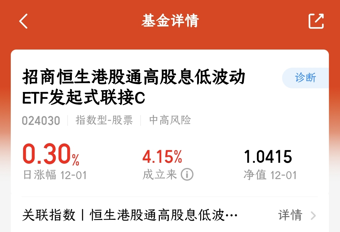 今天股市震荡,低开低走,$招商恒生港股通高股息低波动ETF发起式联接C(OTCFUND|024030)$表现稳健,目前估值上涨0.79%,核心亮点突出。其一,该产品跟踪港股红利低波ETF,高股息率达6%,金融地产占比超六成,展现低波动特性,契合稳健收益需求。其二,配置策略上强调作为底仓工具,费率低廉且分红机制定期优化,为长期投资提供高效支持。产品兼具收益性与防御性,适合追求稳定现金流及分散风险的投资者,在震荡市况中尤其显现配置价值。整体来看,其指数优势与便利持有条件结合,助力资产保值增值,值得关注。