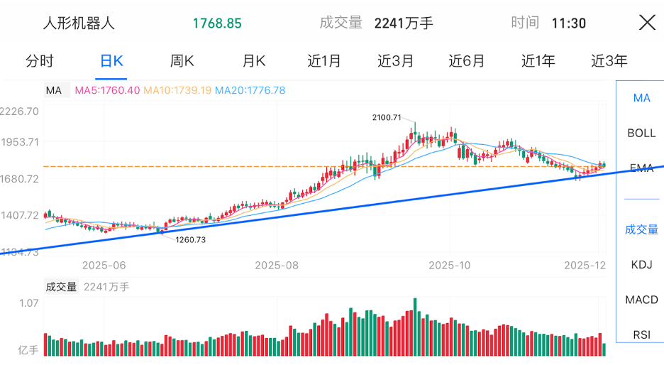 今日加仓1000。2025年被视为人形机器人量产元年,国内规模预计达82.39亿元,占全球近半。《人形机器人创新发展指导意见》明确提出到2027年实现全球领先,关键环节全线推进落地,工业、医疗等场景渗透速度明显提升。从技术面看,前期短暂回撤后止跌反弹,整体仍沿上升趋势运行,有望开启新一轮行情。该基深度布局人形机器人龙头,是相关主题中热度最高的产品之一,虽有短期回调,但年内收益仍超86%,潜力十足。当前在7连阳后的首轮回踩,可能为布局“黄金坑”。