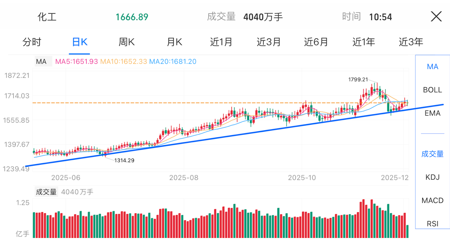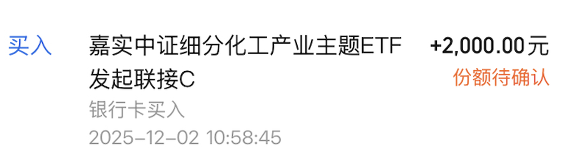 今日加仓2000。近期大盘震荡,但化工板块走势明显强于市场,指数在上升趋势线获得支撑,动能充足,有望延续上升行情。年底市场波动加剧,机构普遍倾向稳健配置,化工凭借现金流稳定、周期弹性适中,自然成为偏好方向。与此同时,制造业回暖与原油企稳,共同强化了周期修复逻辑;在“反内卷”背景下,龙头企业更具竞争力。该基紧跟指数、覆盖行业核心资产,爆发力强,短期虽回调,但近6个月涨幅仍高达34%,优于同类,且费率低。本人持续布局中。