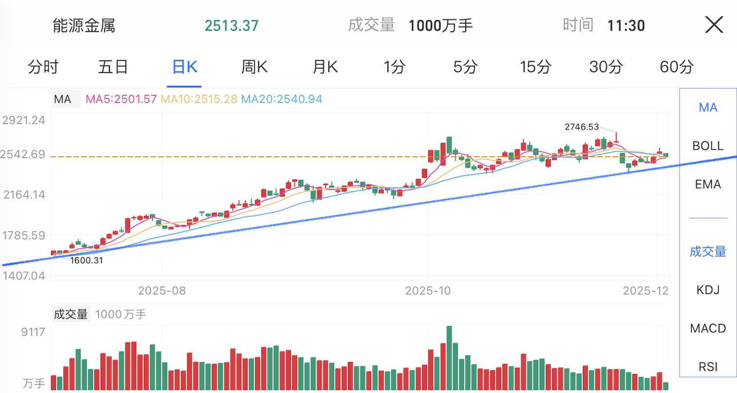 能源金属最近回落至前低支撑区域后出现止跌迹象,但成交量不足,市场博弈仍较谨慎。若资金流入增强,有望形成趋势性反转;否则短期仍维持弱势震荡。