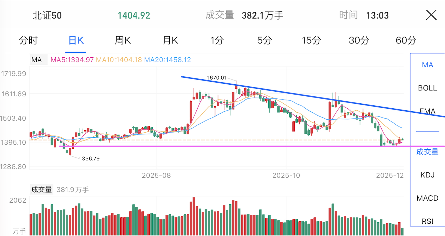北证50 指数震荡下行,已触及前低支撑位,走势疲弱。若支撑位失守,或将面临更深层次调整,整体风险偏高,需谨慎对待。