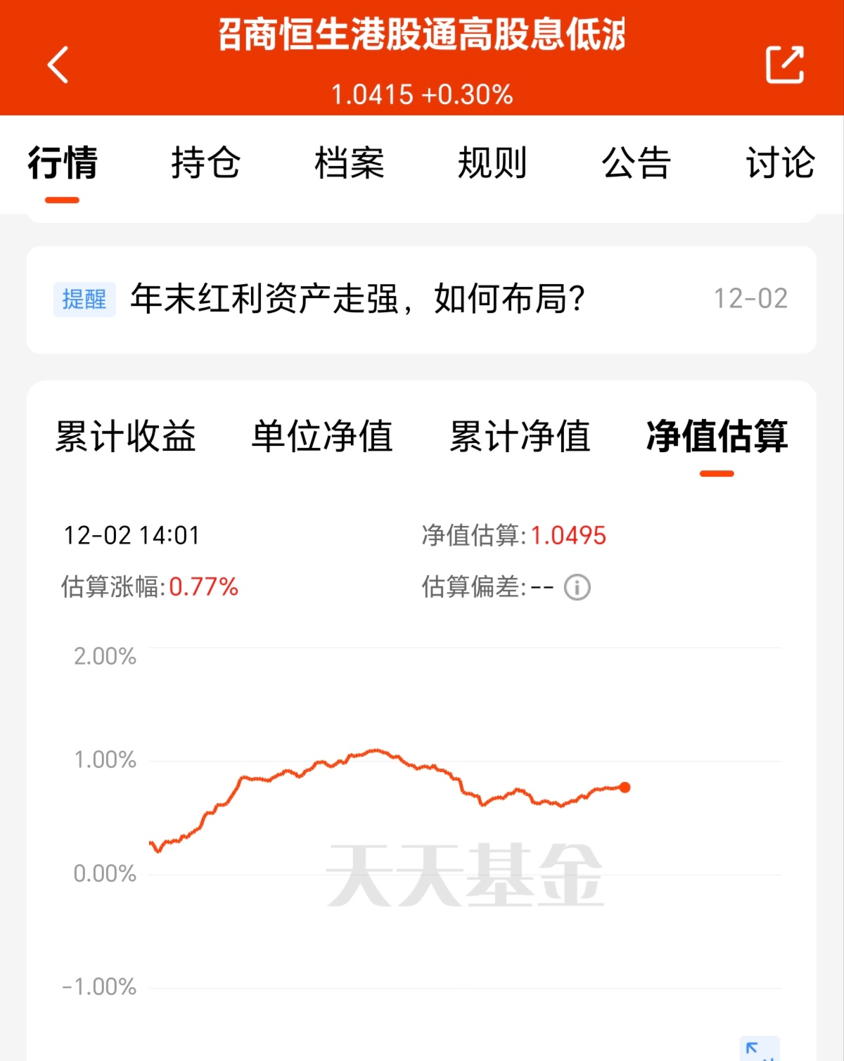 今日A股行情呈现震荡,上证指数也是失守3900点,个股低开低走全线飘绿,前期涨幅过多的科技板块率先回调,但港股通高股息低波动板块,却能带来逆势上涨节奏,其中$招商恒生港股通高股息低波动ETF发起式联接C(OTCFUND|024030)$聚焦港股红利低波,以6%的高股息持续吸引资金流入,同时金融地产权重超60%,低波动特征显著,我也准备定投起来,作为底仓配置啦!