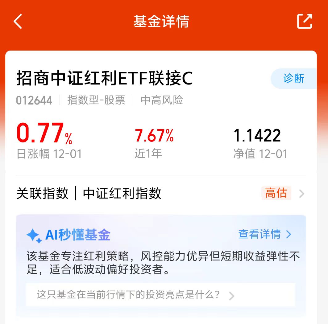 大盘今天震荡调整,大科技板块回调,红利板块防御性还不错,$招商中证红利ETF联接C(OTCFUND|012644)$昨天涨了0.77%,近六个月涨了6.02%,业绩还不错,四季度我还是准备稳一些,保住收益,我打算分批布局红利板块,作为持仓中的压舱石很不错,看好这个方向!