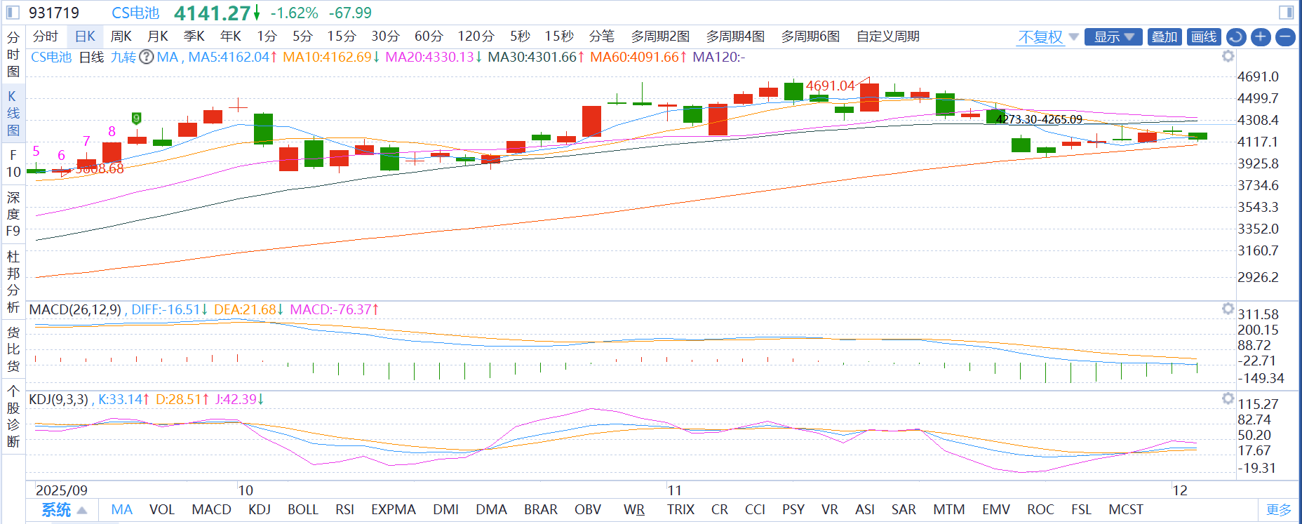 电池:日线随锂矿概念下跌,缩量回踩5日线,但周线多头排列,看涨趋势明确向上。消息面新能源(储能、固态电池)列为跨年行情有望上涨的方向之一,麦爸选择持仓待涨。