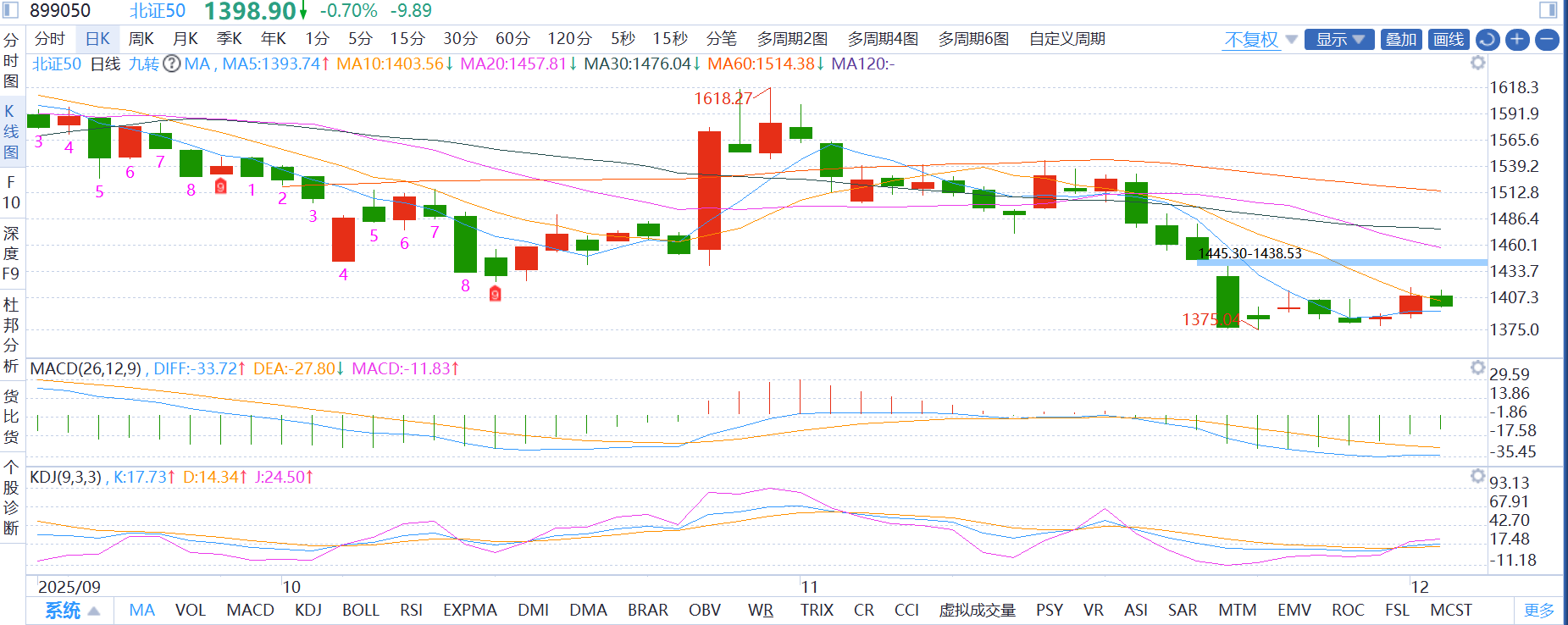北证50:午盘指数跌0.29%,,没破关键支撑。周线仍处上升通道,目前估值低位,政策“深改19条”随时可能发糖,麦爸选择持仓躺平。