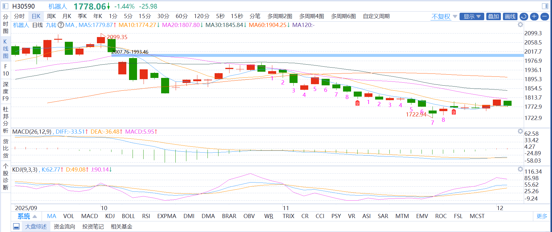 机器人板块:技术面周线上升趋势明确,上周涨6.04%跑赢大盘,日线回调就是低吸机会,麦爸继续持仓看涨。