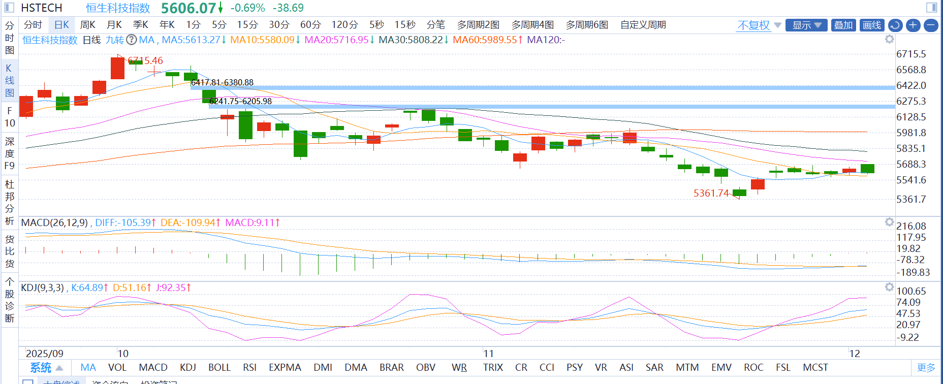 恒生科技:技术面看,周线还是稳稳的上升趋势,虽然今儿日线小幅回调,但没破关键支撑位,属于趋势中的正常震荡,板块趋势没坏,没必要为了短期波动折腾。麦爸持仓看涨。