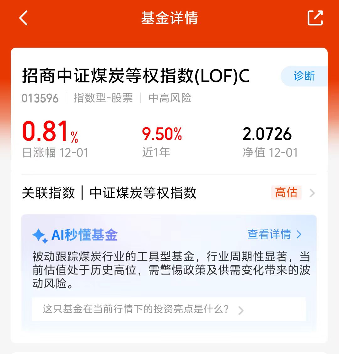 大盘今天震荡调整,科技等板块回落,煤炭今天逆市上涨,$招商中证煤炭等权指数(LOF)C(OTCFUND|013596)$目前预估涨幅0.44%,煤炭板块长期来看发展前景还不错,近三个月涨了8.42%,近六个月涨了18%,长期看好这个方向,我准备分批布局一波,慢慢积累筹码!