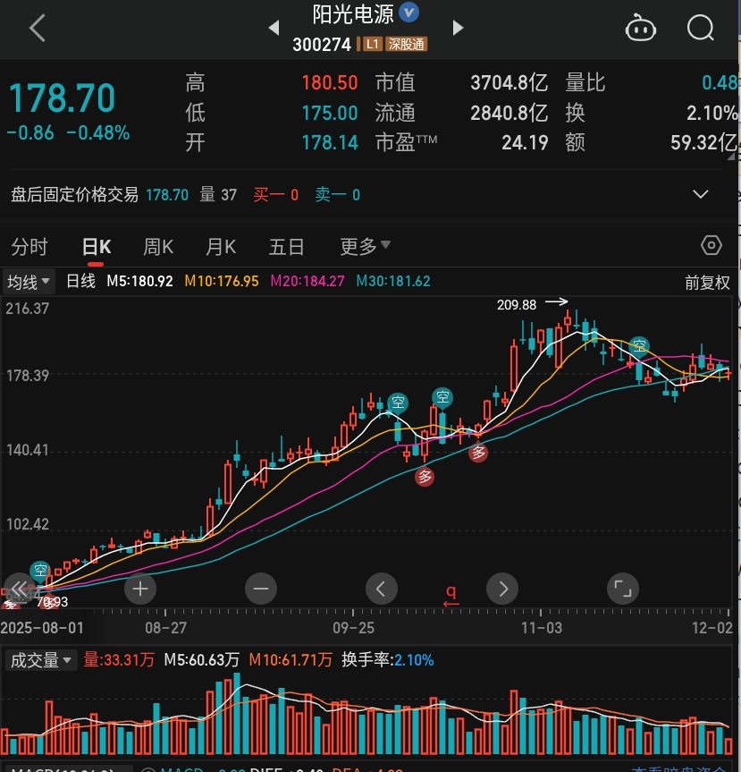 再来看看电池和光伏的灵魂人物阳光电源,今天成交也是大幅萎缩,怎一个惨字了得,尤其是光伏,感觉都被主力抛弃了。