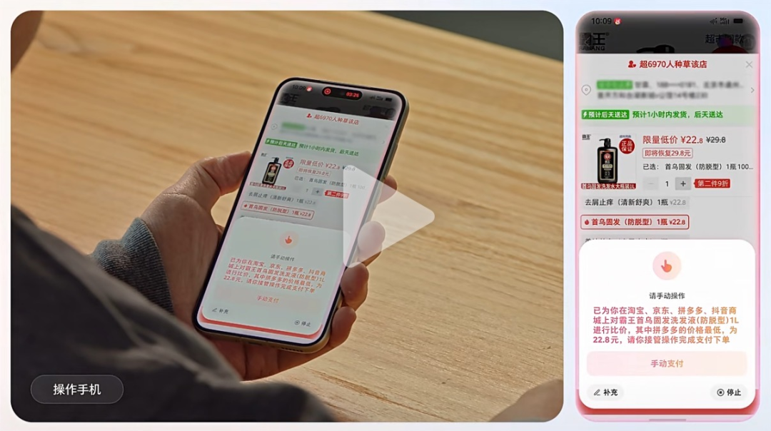 简单说下,AI手机最大的区别,以前的手机需要自己手动操作,AI手机是智能体,需要提供一个指令,系统会按照指令自动完成。