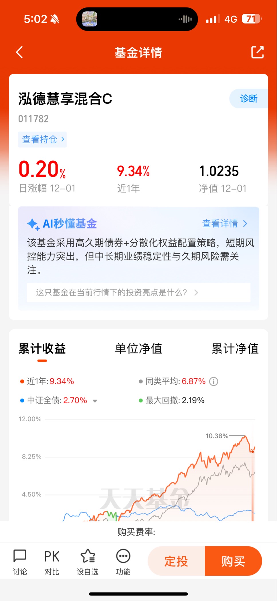 慧享吧,今年固收+太多产品了,每天都能刷到很多推荐,但为什么和泓德慧享结缘呢,因为观察了一段时间,波动不大,收益比较高,红的天数也多,后面我同时买了6只固收+,能观察到泓德慧享每次跌了一些后再涨回来的速度还是比较快的,对于这种产品我个人比较拿的住,这是我最满意的点,祝福泓德基金越来越好,希望姚经理继续加油。