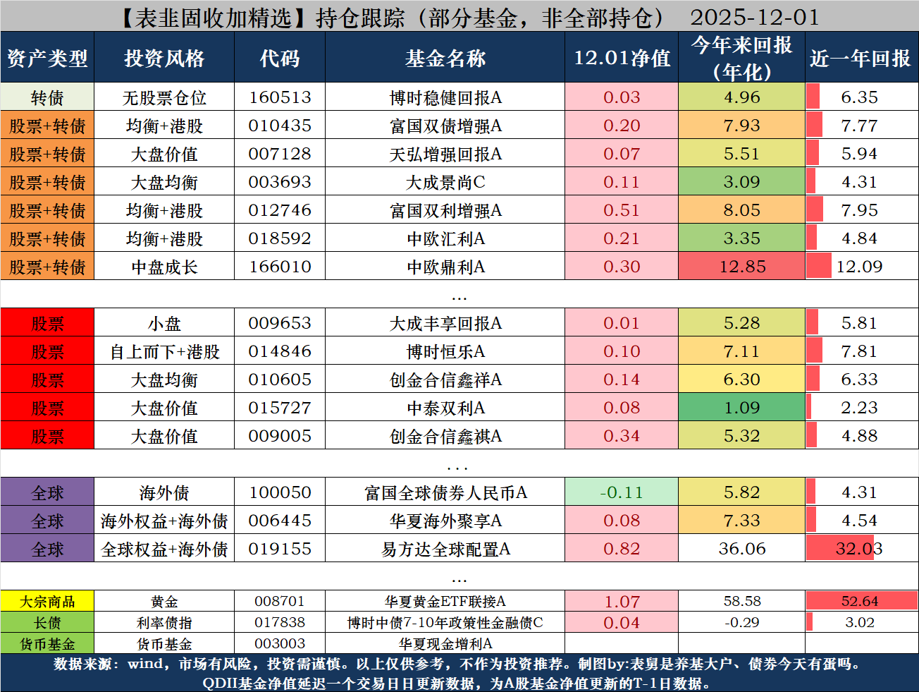 另外,就是一定要做分散配置,不要相信任何所谓的“大牛基”,很简单的数学题,比如以表韭固收加为例,基本单只产品的比例会控制在4%以内,如果其中有一只基金持有的5%的债券踩雷了,即使跌到0元(比较极端,通常是从100块跌到小几十块),那么对整体组合的影响也就至多4%*5%,也即0.2%左右,这就属于可以承受的痛。