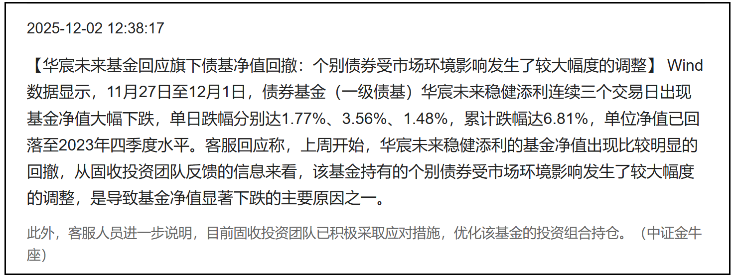 近期龙头房企的风险事件,对基金产品,也产生了实际影响,比如下面这则报道,基金公司旗下的一级债基,三天累计跌了近7%,公司表示是个别债券受市场影响,发生了较大的调整,至于是哪家公司的债券,大家自己想想就知道了。