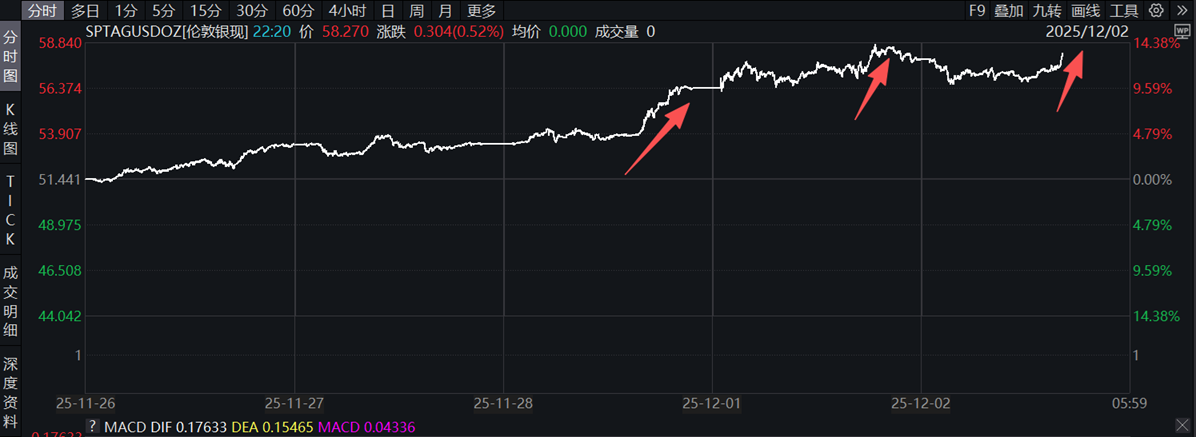 还是昨天说的,第一,补库的数量还是太小了,相比之前下降时的量级不够看;第二,上期所补库好像没有影响行情,该涨还是涨;第三,这几天涨的时段都是外盘,今天和昨天白天的亚洲交易时段都是下跌的,但是28号晚上、1号晚上,白银的上涨时段都和美股开盘时间高度重合,一到晚十点准时拉升,今天夜盘开盘,好像又是这样。