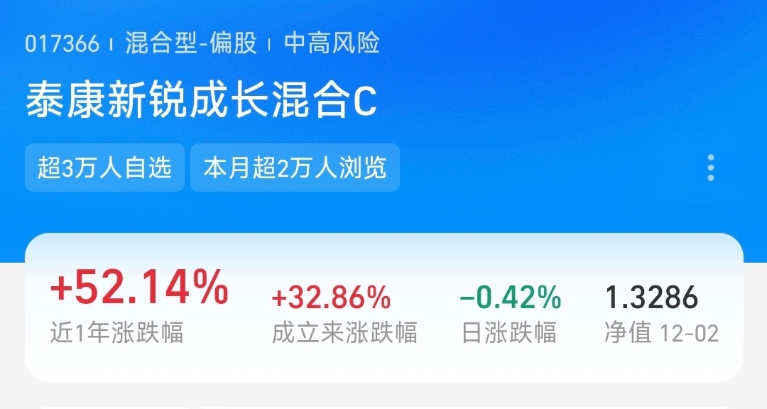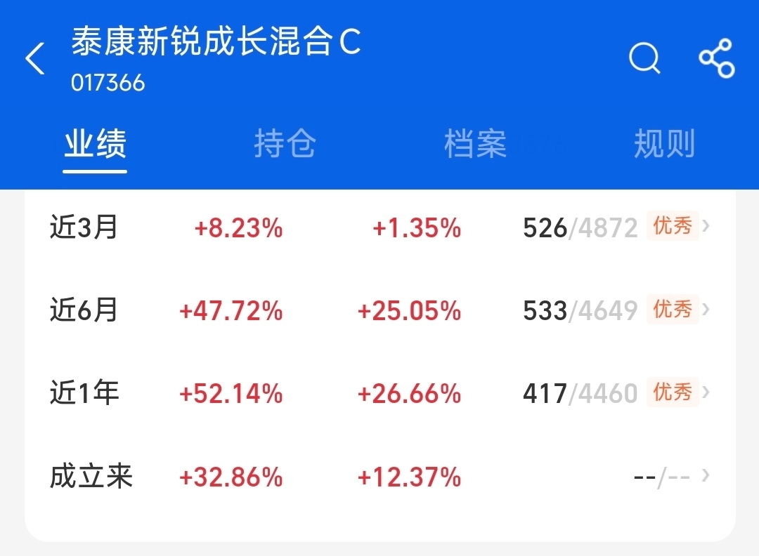 今天科技板块再度活跃,AI和半导体领涨,我更加确信自己对泰康新锐成长混合C的判断——它近一年大涨52.14%,远超同类平均,绝非偶然。这只基金专注AI+半导体赛道,持仓集中在先进制程设备、AI芯片设计等算力基建核心环节,像中微公司、寒武纪这类技术壁垒高、海外订单能见度强的硬科技企业,都是它的重仓标的。