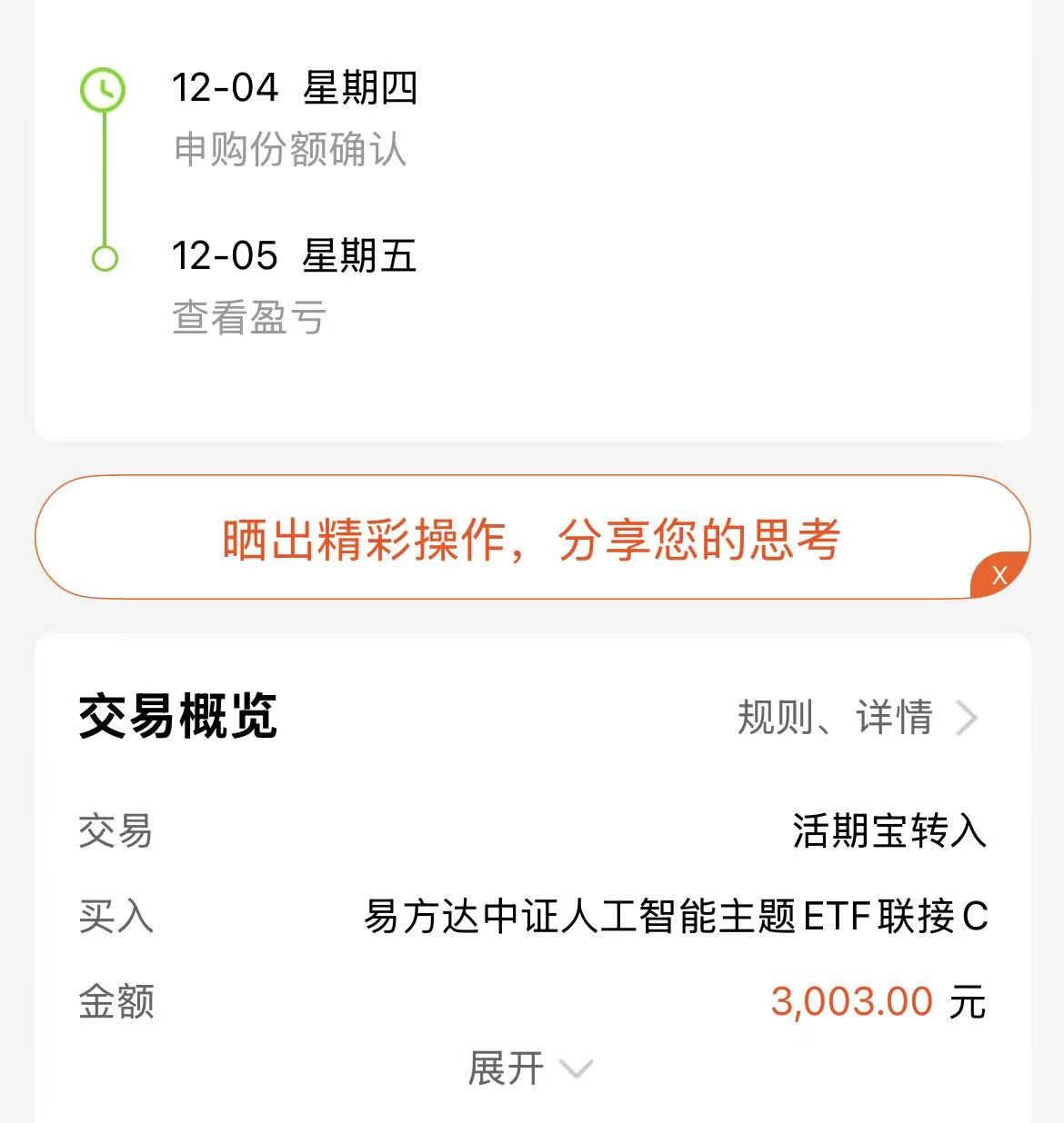 今天大盘继续调整了,科技方向回调的还是多的,不过我觉得科技还是未来的主线。“人工智能+”行动与场景培育政策密集落地,大基金三期加码算力芯片,AI产业前景不错。易方达人工智能主题ETF联接C持仓覆盖AI全产业链,重仓中际旭创、新易盛等光模块龙头及寒武纪等,我今天逢低布局起来。