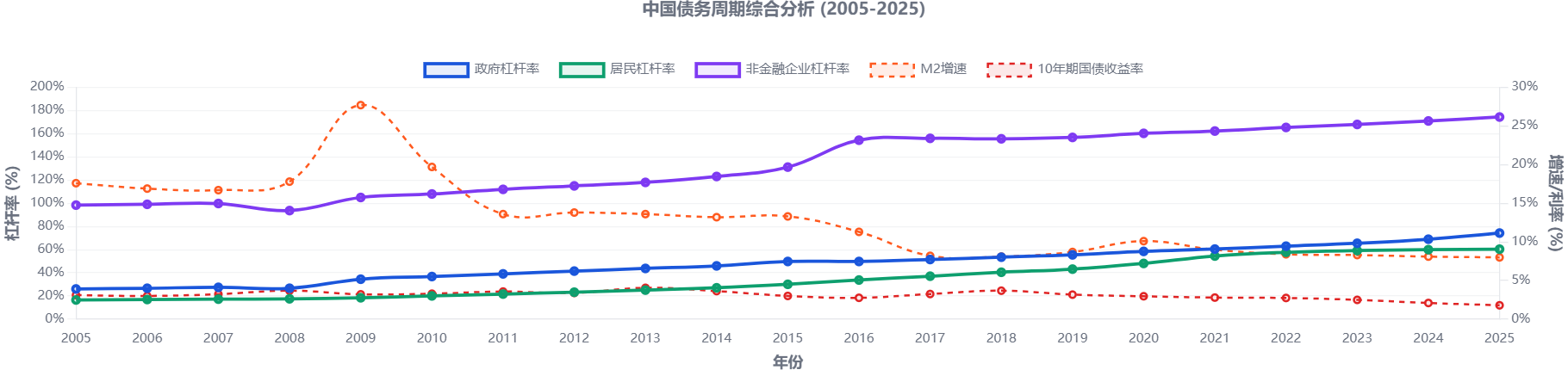 近五年中国债务周期步入“去杠杆+结构优化”阶段,宏观杠杆率缓慢回升,风险集中于企业部门与地方政府隐性债务。资金面呈现“宽货币、低利率”特征:10年期国债收益率从2.97%降至1.8%,1年期存款基准利率稳定在1.5%,M2增速维持8%左右,社融增速温和回落至8%,资金价格与规模适配债务化解需求。政策以“系统治理”为主线,通过化债工具、专项债扩容、盘活国有资产缓释风险,地方隐性债务规模收缩。未来需持续依托低利率环境减轻债务成本,以新质生产力提振经济,优化融资结构、扩大直接融资占比,实现债务风险可控与经济高质量发展的良性循环。