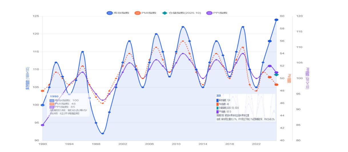 从库存指数、PMI(采购经理指数),PPI(工业生产者出厂价格指数)以及仓储指数综合判断,当前处于被动补库存向主动去库存过渡的阶段。这一结果的出现与反内卷政策息息相关,投资者更应该看重市场自身去库存的力量。从10月的PPI数据来看,有效需求不足对库存的消化有很大的拖累。11月综合PMI产出指数为49.7%,创下自2022年12月以来的最低水平。制造业PMI指数连续八个月处于49-49.8%的区间,受到外部需求疲软、供应链调整以及出口商谨慎态度的影响。服务业商务活动指数自2022年12月以来首次陷入低于50%,为49.5%,因消费者信心降温、业务扩张放缓,以及企业预算紧缩。