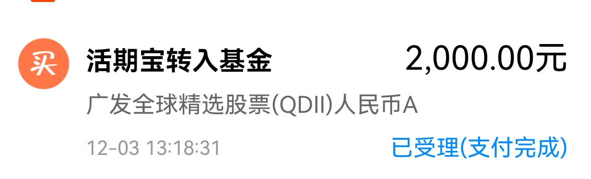 我加仓 $广发全球精选股票(QDII)人民币A(OTCFUND|270023)$2000元(点蓝色字体或产品卡可直达)。此前在“AI泡沫论”+美联储降息预期降温影响下,美股有所调整,不过随着美联储转鸽,谷歌TPU产量预期猛增推动下,此前利空影响褪去,美股因此再度火热,小欧个人也是看好美股机会。一是AI热重燃,吸引资金炒作;二是当前A股市场行情轮动加剧,小欧是不打算把鸡蛋都放在同一个篮子里,因此我思路是分散配置。