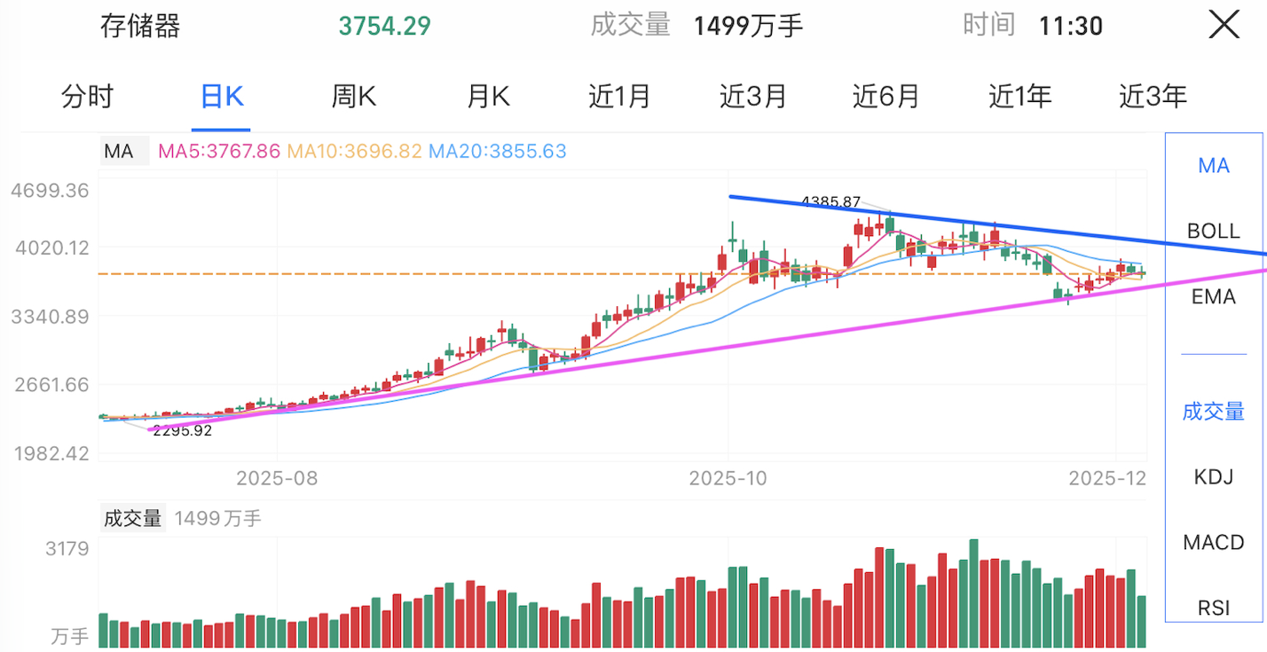 存储芯片经过深度回调后,板块在中长期趋势线附近企稳,成交量同步放大,表明资金开始低位承接,技术修复动力增强。若资金持续介入,龙头股保持反弹,板块有望重拾强势并挑战上方阻力;否则可能陷入横盘震荡或二次探底。
