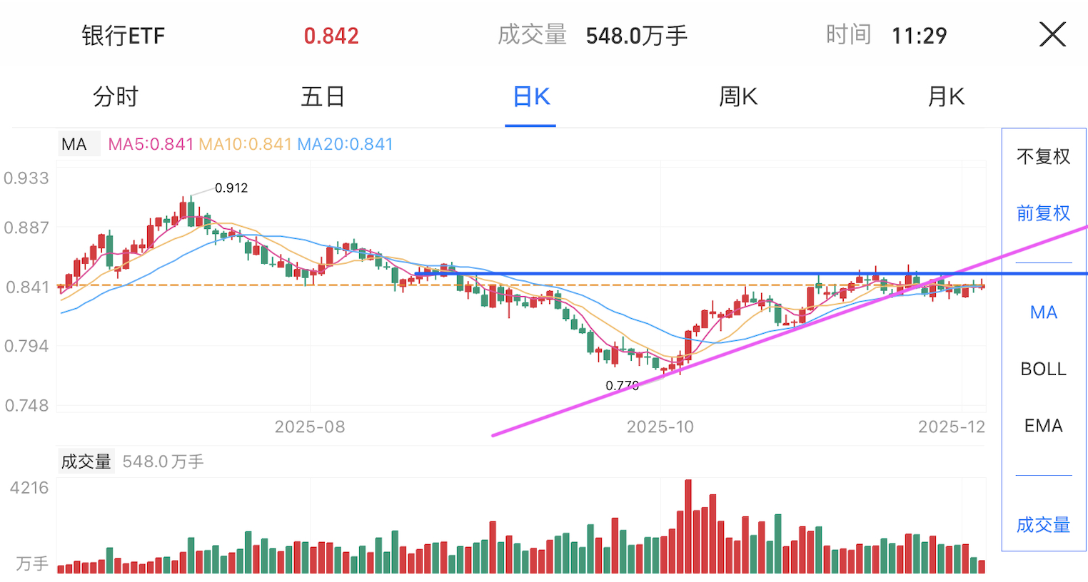 银行在反弹停滞后跌破短期趋势线,进入横盘震荡阶段,方向暂不明朗。作为大盘稳定器,资金流向及宏观政策环境决定后市走向,短期内预计维持震荡。