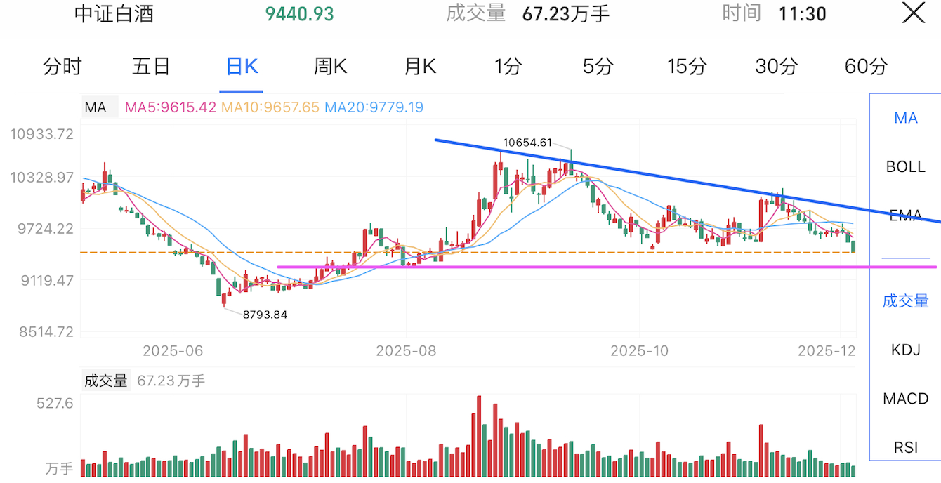 白酒持续在底部区间缩量震荡,缺乏强劲上涨动力。这两日已经跌破前低支撑位,逐渐靠近最低点。若支撑有效,则维持底部震荡。