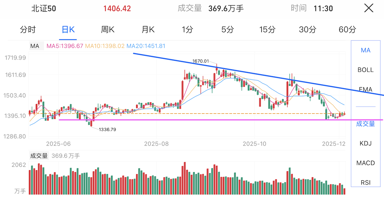 北证50 震荡下行,已触及前低支撑位,走势疲弱。 若支撑位失守,或将面临更深层次调整,整体风险偏高,需谨慎对待。